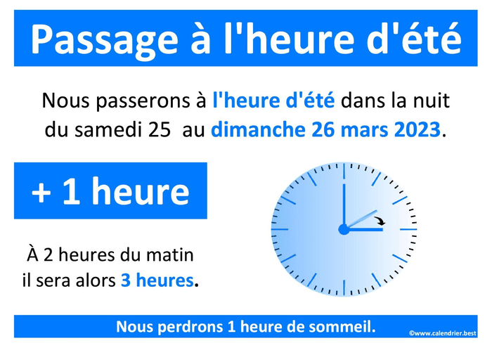 Passage à l'heure d'été dans la nuit du samedi 25 au dimanche 26 mars 2023 - via calendrier.best