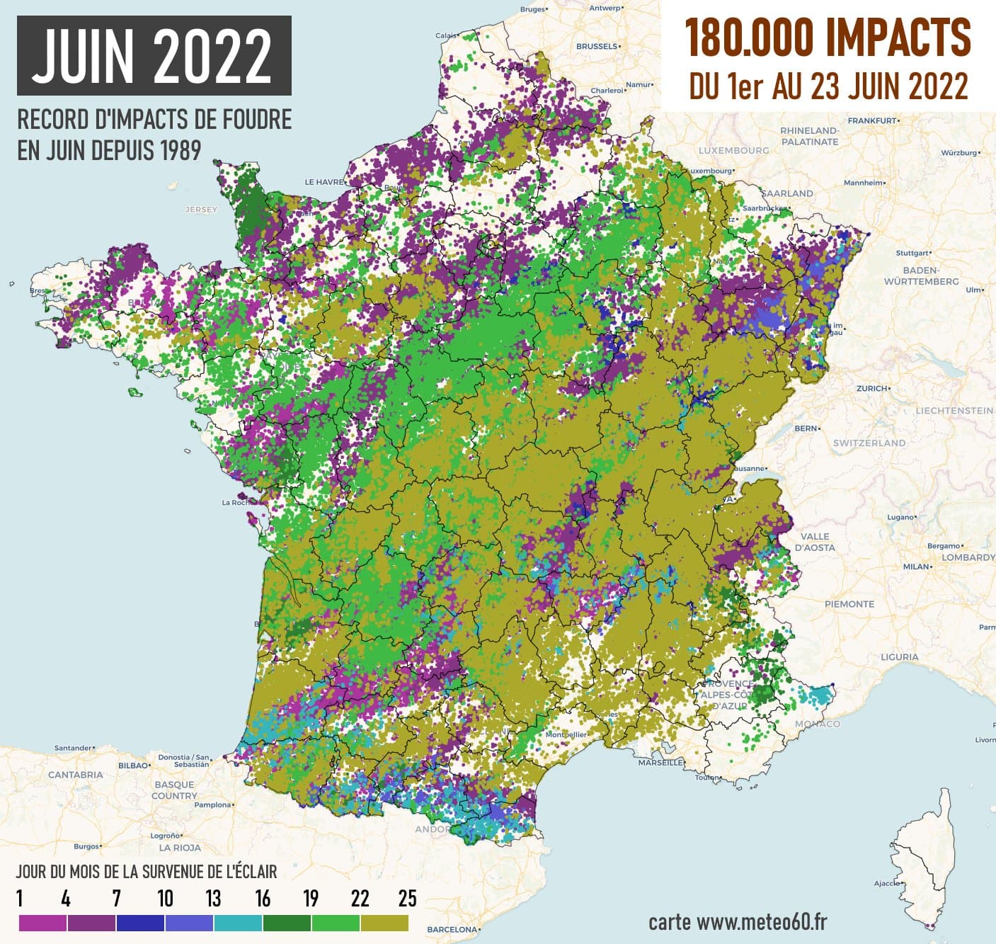 180.000 impacts de foudre ont frappé la France du 1er au 23 juin 2022 - via meteo60.fr