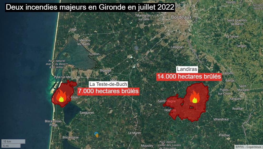 Sécheresse et chaleurs caniculaires créent un environnement très favorable aux incendies, qui se multiplient en France au fil des semaines. Les plus gros brasiers sévissent en Gironde entre le 12 et le 20 juillet 2022. Au total, ce sont quasiment 21.000 hectares qui ont été détruits dans les secteurs de la Teste-de-Buch et de Landiras. Cette superficie est très impressionnante, d'autant que d'importants moyens ont été engagés au sol comme dans les airs. Sans ce travail acharné des pompiers, le bilan aurait été encore plus lourd. Au total, 36.750 personnes ont été évacuées, dont de nombreux vacanciers.