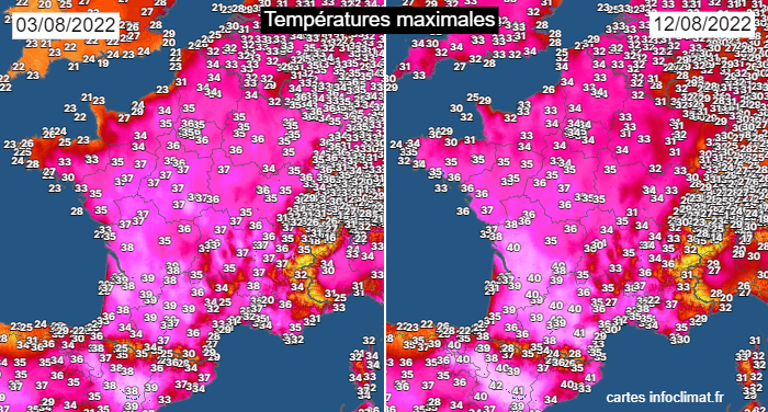 Températures maximales en France les 3 et 12 août 2022 - via infoclimat.fr