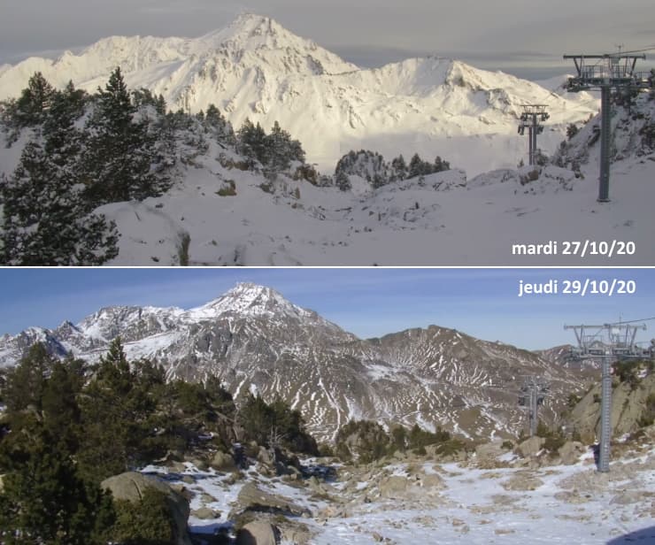 Comparaison de la Mongie (Hautes-Pyrénées) entre le mardi 27 et le jeudi 29 octobre 2020 - webcam skaping