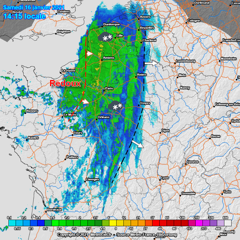 Le front neigeux se décale peu à peu vers l'Est au fil de l'après-midi alors que le redoux aborde les côtes de la Manche et l'Ouest de la région parisienne entre 14 et 15h, marquant la fin de l'épisode neigeux dans ces secteurs.