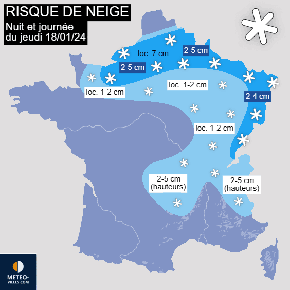 Cumuls de neige prévus en nuit de mercredi à jeudi puis journée de jeudi 18 janvier 2024 - Météo Villes