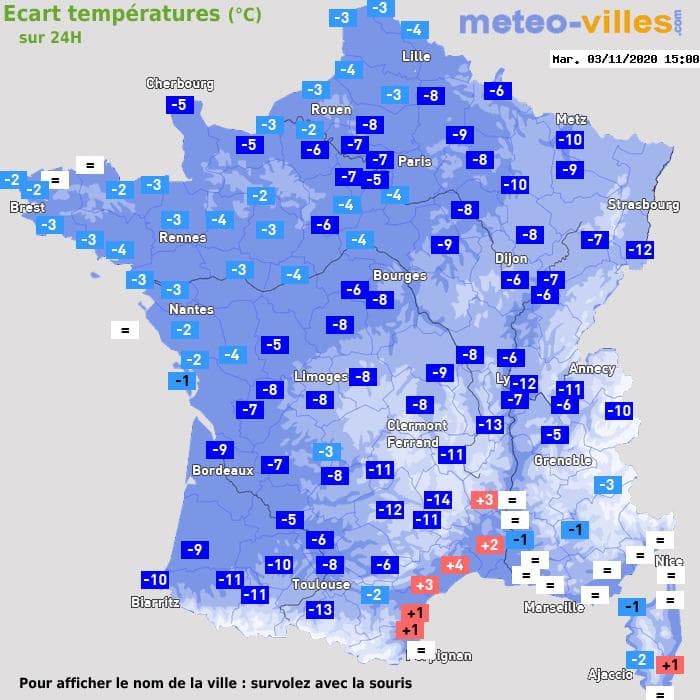 Écart des températures sur 24h entre le 2 novembre à 15h et le 3 novembre à 15h - Météo Villes