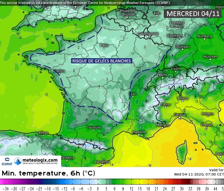 Températures minimales et risque de gel pour le mercredi 4 novembre 2020 - modèle CEP via meteorologix