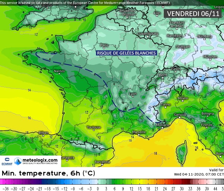Températures minimales et risque de gel pour le vendredi 6 novembre 2020 - modèle CEP via meteorologix