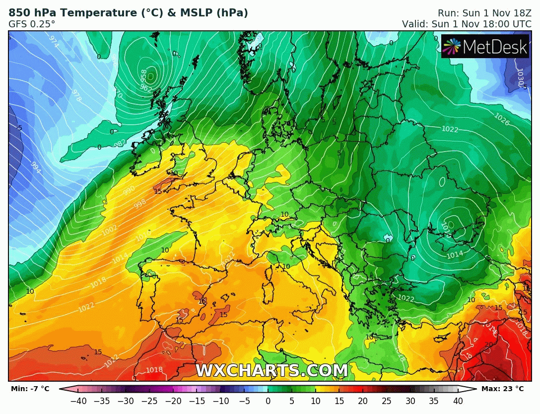 Évolution de la masse d'air du lundi 2 au samedi 7 novembre 2020 - via wxcharts.com