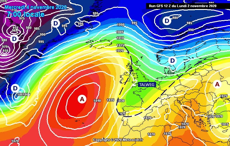 Nous étions jusqu'au lundi 2 novembre 2020 sous l'influence d'une cellule anticyclonique positionnée sur l'Europe Centrale et dirigeant un flux de sud-ouest particulièrement doux sur notre territoire. Les hautes pressions présentes sur le centre du continent européen se sont quelque peu affaissées tandis que l'anticyclone des Açores s'est renforcé.