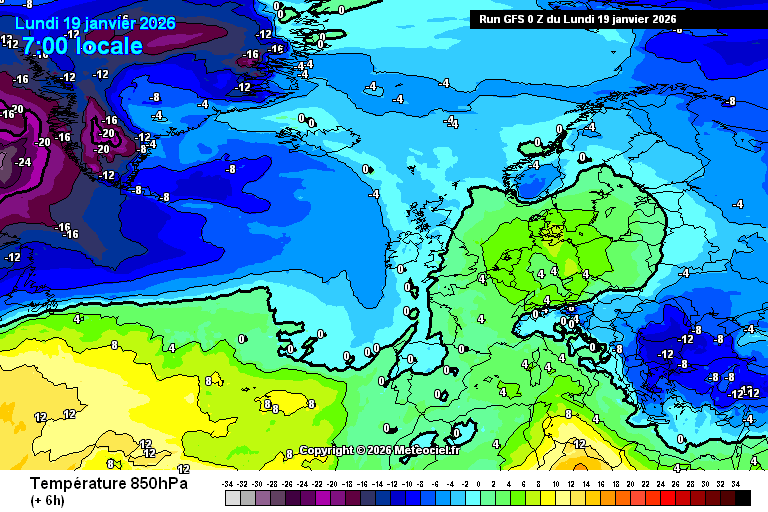 Animation des températures à 850 hPa sur l'Europe du 19 au 27 janvier 2026 – GFS via meteociel.fr