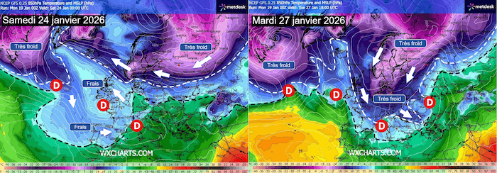 Comparaison de la situation envisagée en fin de semaine et la semaine prochaine – Modèle GFS via WX CHARTS