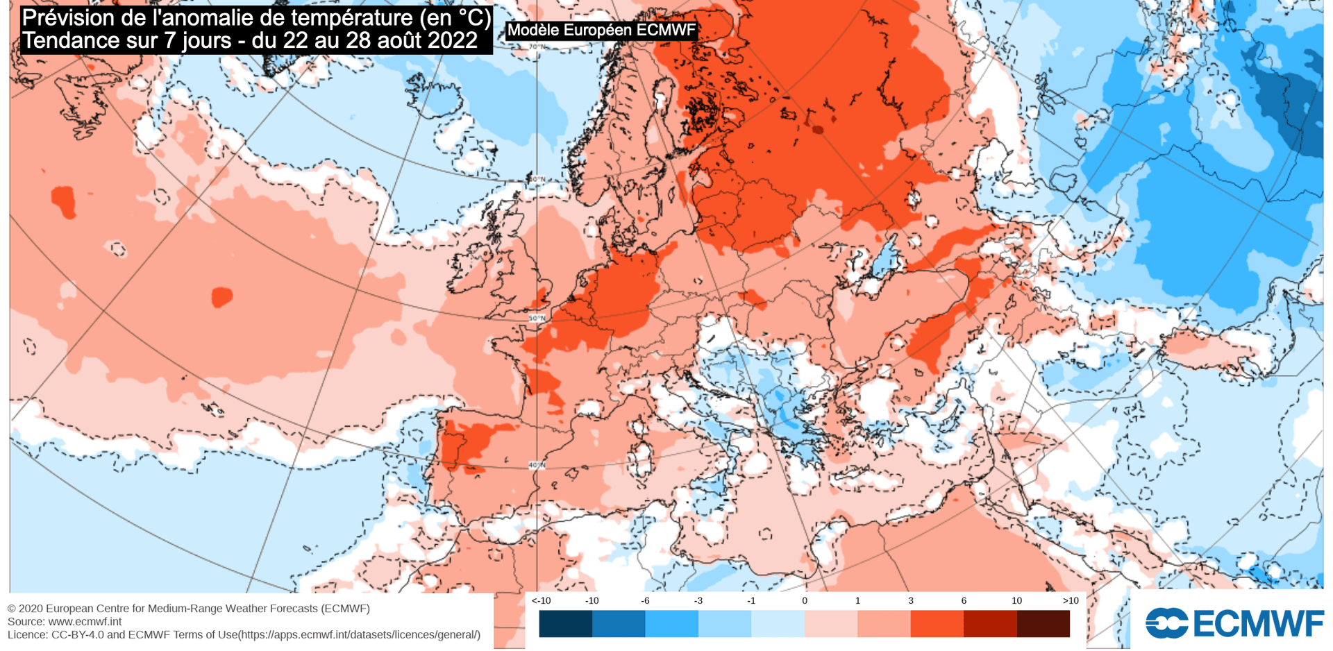 La semaine à venir s'annonce dès lors assez chaude, avec un excédent thermique concernant la totalité du pays... et même une très large majorité de l'Europe. Au cours de la semaine du 22 au 28 août, nous devrions nous situer en moyenne 3°C au dessus des moyennes de saison, voire davantage du Centre-Ouest au Nord-Est.