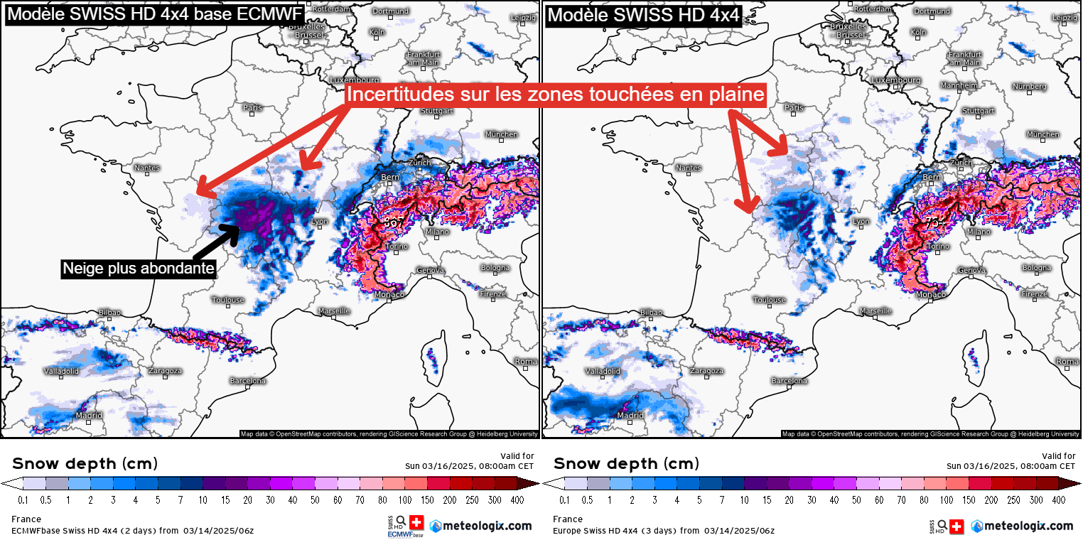 Comme souvent dans ce type d'épisode, des incertitudes persistent même à quelques heures du début de l’événement. La tenue au sol en plaine peut en effet se jouer à seulement quelques dixièmes de degrés, ce qui engendre un risque de tenue en plaine radicalement différent en fonction des modèles.
