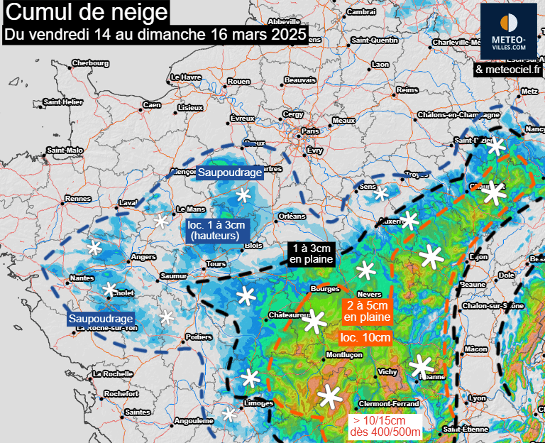 Si la neige devrait facilement tenir au sol entre le Nord du Massif Central, le Centre et le Sud de la Lorraine dès les premières hauteurs, la tenue s'annonce toutefois plus difficile en plaine en raison de températures à peine trop "douces". Toutefois, un saupoudrage voire 1 à 2cm pourront tomber sur les plaines du Centre de la France avec une neige tenant plus facilement dès les premières hauteurs, notamment samedi matin puis en soirée et nuit suivante. La neige pourra également s'étendre jusque dans la Brenne la nuit suivante.