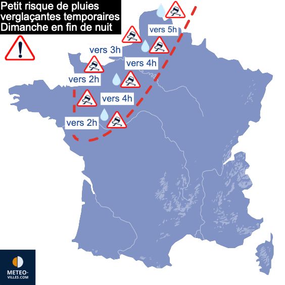 Avant d’expliquer ce phénomène, sachez que le risque sera de nouveau présent en cours de nuit ou tout début de matinée de dimanche, lorsque l’air doux d’origine océanique reprendra le dessus par l’ouest. À l’arrivée de la perturbation, les pluies tomberont sur des sols froids avec des température parfois inférieures à 0°C, engendrant des formations de glace par endroit entre les Pays de la Loire, la Normandie, les Hauts-de-France et Île-de-France.