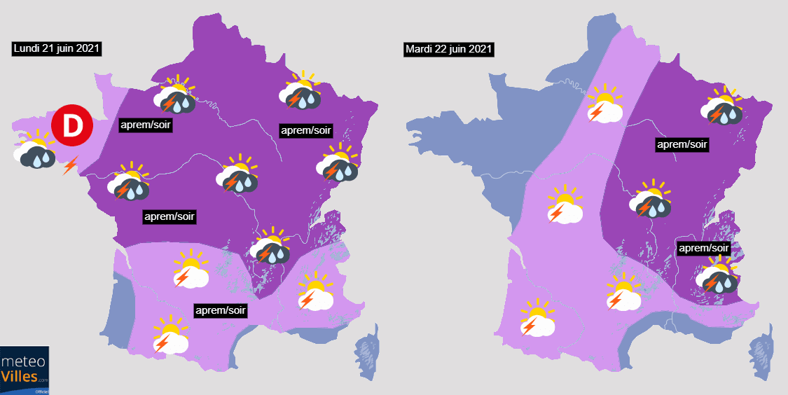 Prévision du risque orageux pour les journées du lundi 21 et du mardi 22 juin 2021 - Météo Villes