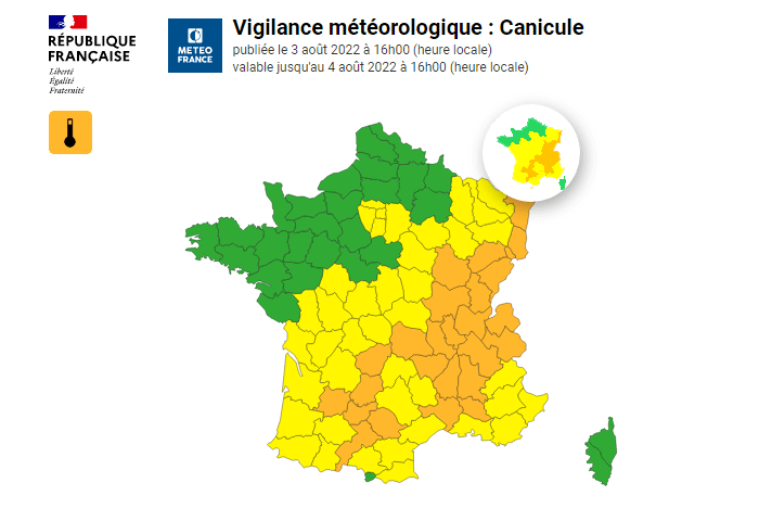 Carte de vigilance canicule en vigueur ce mercredi 3 août 2022 à 16h - via Météo France