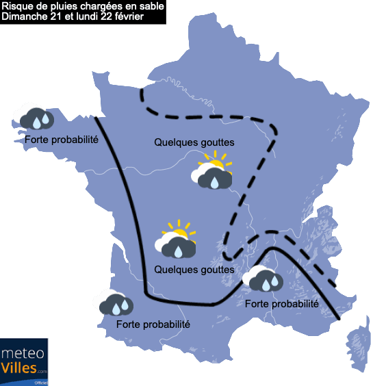 Ce flux de Sud devrait s'accompagner de quelques pluies sur certaines régions, qui seront dès lors fortement chargées en sable. Une "pluie de boue" qui pourrait se produire entre ce dimanche et ce lundi sur l'arc Atlantique, près des Pyrénées, ainsi que sur le pourtour Méditerranéen, laissant un probable dépôt sur les surfaces (inutile donc de laver votre véhicule ce samedi !). Un infime risque existe également du Limousin à la Basse-Normandie, en passant par le Centre-Val-de-Loire, sous forme de quelques gouttes, elles aussi très chargées en sable Saharien.