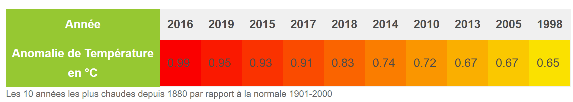 L’année 2016 fut la plus chaude jamais relevée à l’échelle du globe avec une anomalie de +0.99°C par rapport à la normale 1901-2000 et +0.63°C par rapport à la normale 1981-2010. Depuis cette année exceptionnelle, 3 années se sont classées dans le top 5 des plus chaudes jamais enregistrées dont 2019 qui fut la deuxième.