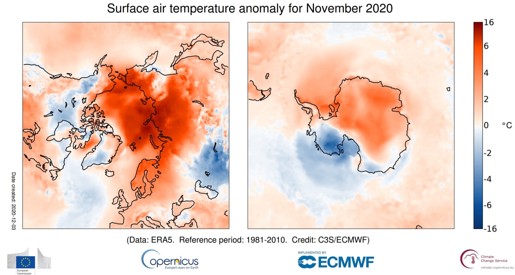 Anomalies de températures aux hémisphères Nord et Sud durant le mois de novembre 2020 d'après la période 1981-2020 - Copernicus
