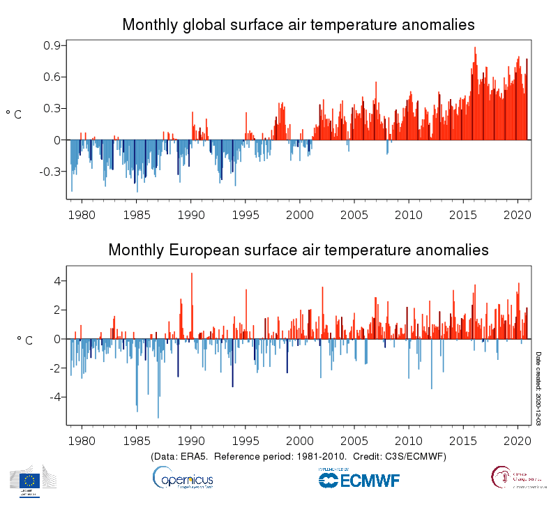 Le mois de Novembre s’est terminé et celui-ci fut classé comme le plus chaud jamais enregistré depuis le début des relevés à l’échelle du globe. Avec une anomalie de +0.77°C par rapport à la moyenne 1981-2010, il s'inscrit dans la continuité d’une année 2020 rivalisant avec l’année 2016, l’année la plus chaude enregistrée sur terre depuis le début des relevés météorologiques.