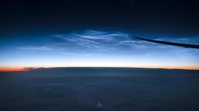 S'ils peuvent être observés sur la Terre, les nuages noctulescents sont également visibles depuis les avions puisqu'il faut rappeler que leur altitude de croisière est d'environ 10 kilomètres tandis que ces formations nuageuses illuminées circulent généralement 7 à 8 fois plus haut !
