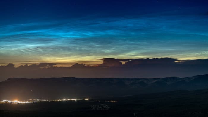 Bien que moins fréquemment observables dans le sud du pays, les nuages noctulescents se sont montrés dans le ciel des régions méditerranéennes au début de la semaine, comme le montre le cliché ci-dessus pris dans le Var. Sur ce dernier, on constate très bien que les nuages d'orages, malgré leur altitude plutôt élevée, sont plongés dans le noir de la nuit tandis que les nuages noctulescents sont encore illuminés par le Soleil.