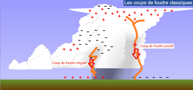 Schéma simplifié des coups de foudres classiques, positifs et négatifs et de la répartition des charges associées