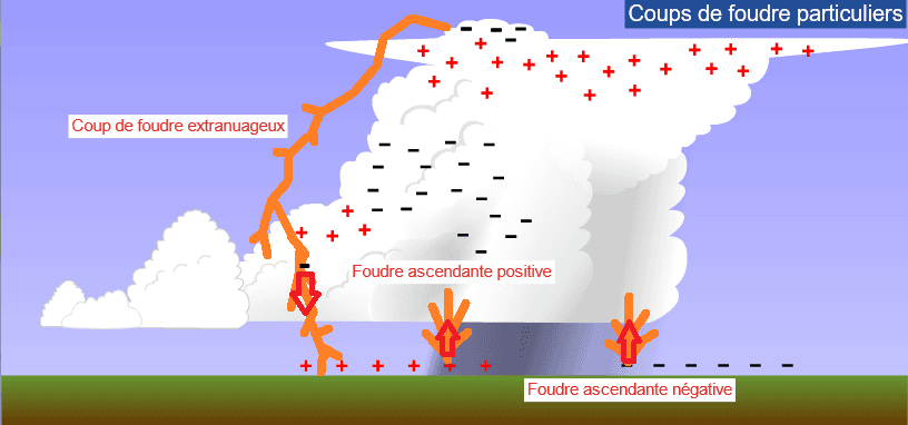 Schéma simplifié des coups de foudres particuliers et de la répartition des charges associées