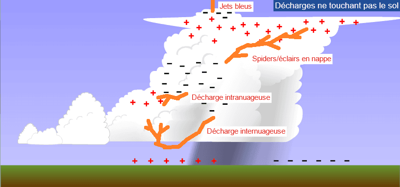 Ces décharges vont des plus courantes (éclairs intranuageux) aux plus rares (jets bleus et phénomènes lumineux transitoires qui pourront faire l'objet d'un prochain article). Elles se produisent au sein même du nuage et peuvent sortir à sa périphérie.
