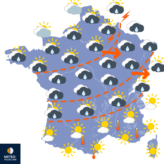 L'axe orageux suivra les limites de la masse d'air chaud, comme le montrent bien nos cartes de prévision entre aujourd'hui et jeudi prochain: