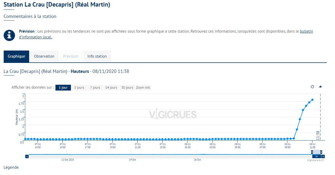 Crue rapide du Réal Martin (+1.5m en 1h30) sur la commune de la Crau en milieu de matinée du Dimanche 8 Novembre - Via Vigicrue