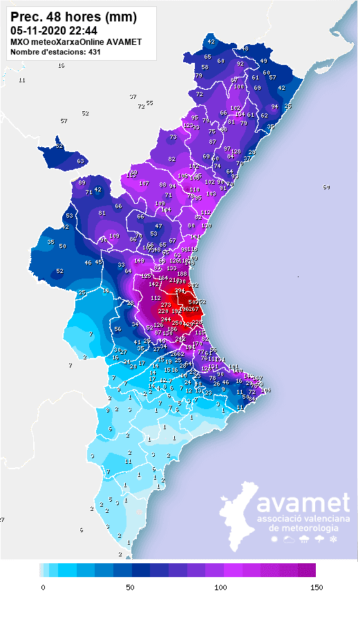 Cumuls de précipitations en 48h (entre le 4 et le 5 Novembre) sur la province de Valence -
