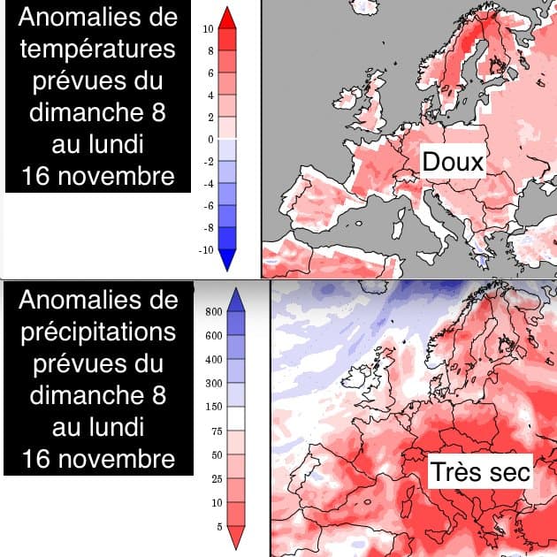 Prévisions des anomalies de températures et de précipitations durant la semaine du 9 au 16 Novembre - Modèle GFS via WXCHARTS