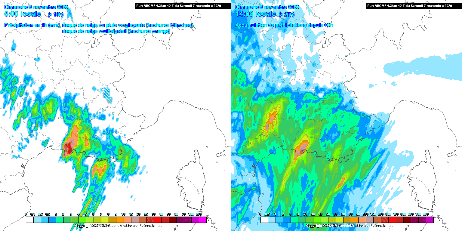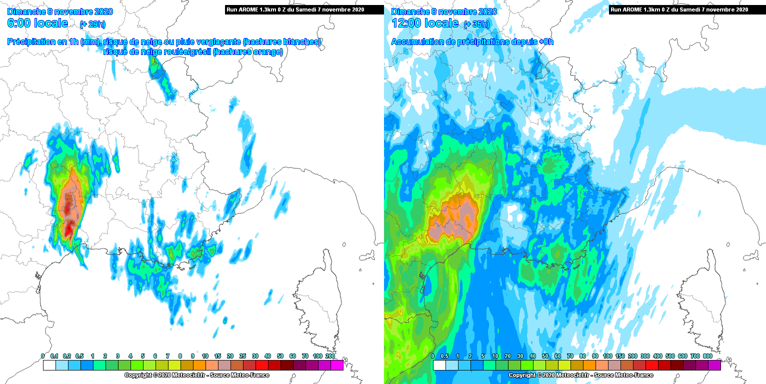Intensités horaires maximales (gauche) et cumuls totaux (droite) envisagés par le modèle arome du Samedi 7 Novembre au matin (00z) - via Météociel.fr