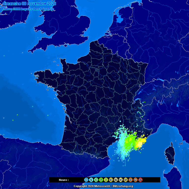 Impacts de foudre détectés durant la nuit du Samedi 7 au Dimanche 8 novembre sur le Sud de la France - Via Météociel.fr