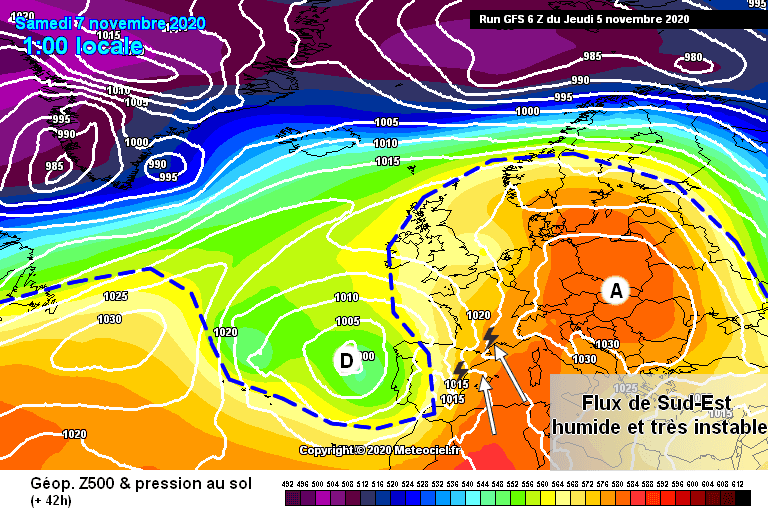 Schéma de la situation atmosphérique ce Samedi 7 Novembre sur l'Ouest de l'Europe - Modèle GFS via météociel.fr