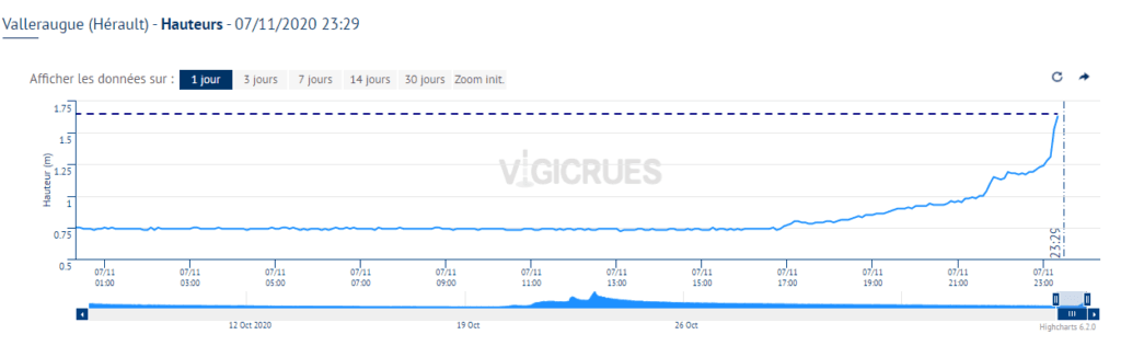 Crue soudaine et modérée du fleuve Hérault à Valleraugue (34) en début de nuit de Samedi 7 à Dimanche 8 Novembre - via Vigicrue