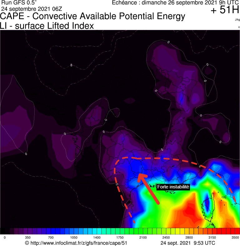 C'est entre la nuit de samedi 25 à dimanche et durant la journée du dimanche 26 septembre que les orages les plus actifs sont attendus. En effet, l'avancée de la zone dépressionnaire vers le Nord-Ouest va provoquer une accentuation du flux de Sud entre la Méditerranée, les Alpes et la Vallée du Rhône. La mer se montrant encore chaude en cette fin septembre et de l'air plus frais arrivant en altitude, un afflux d'instabilité important va s'opérer sur ces régions, atteignant localement plus de 2000j/kg près des littoraux, ce qui reste assez peu fréquent à cette période de l'année.