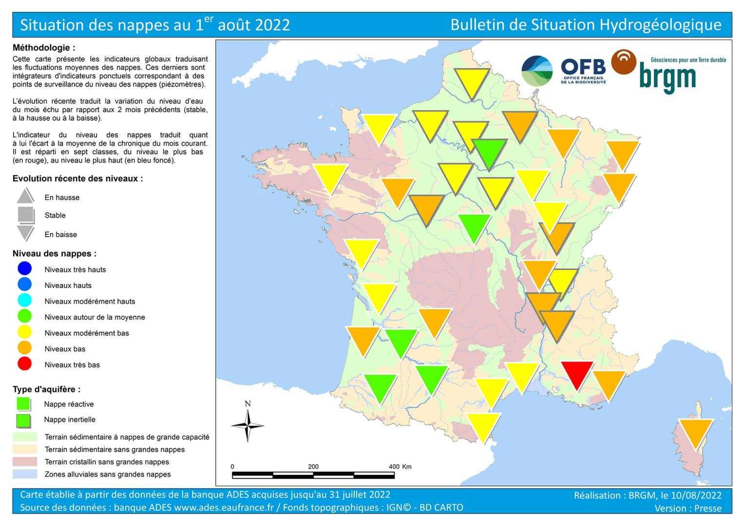 Au 1er août 2022, la plupart des nappes phréatiques du pays affichaient des niveaux inférieurs à la normale. La situation était souvent critique du centre-ouest aux régions de l'est et jusqu'en Corse avec des niveaux bas voire très bas et tous orientés à la baisse. Depuis, plusieurs salves orageuses ont circulé mais avec des sols très secs en surface, l'eau ne s'est que très peu infiltrée en profondeur. La saison de recharge des nappes phréatiques n'a de toute façon pas véritablement débuté. C'est en automne et en hiver qu'il faudra qu'il pleuve en quantité pour permettre une recharge de qualité.