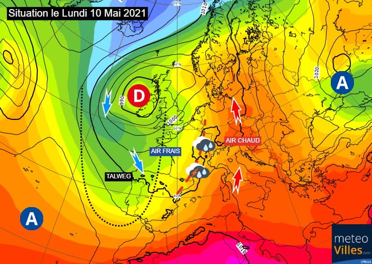 Durant le week-end des 8 et 9 mai 2021, l'anticyclone temporairement positionné sur le centre de l'Europe a entraîné une pulsion d'air chaud au dessus de la France. Dans le même temps, une dépression très dynamique sur l'Irlande étendait un profond talweg en direction du Portugal. L'approche de ce système a causé l'arrivée d'air frais par l'ouest, entraînant le déclenchement de pluies et d'orages.