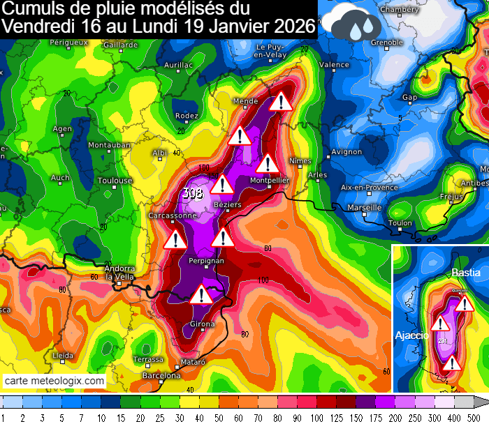 Les fortes pluies débuteront notamment ce vendredi 16 janvier 2026 sur les Cévennes puis elles gagneront tout le Languedoc samedi avant de s'étendre à la majeure partie des départements méditerranéens dimanche avec une activité plus prononcée sur les Cévennes et l'est de la Corse. Lundi, les plus fortes pluies devraient concerner l'Aude et les Pyrénées-Orientales et l'est de la Corse. En quelques jours, il devrait tomber fréquemment entre 150 et 300 mm des Cévennes au Roussillon ainsi que sur l'est de la Corse et la montagne ! Certains scénarios vont jusqu'à 400 mm, notamment dans les Cévennes héraultaises. Il conviendra donc de surveiller la réaction des cours d'eau.