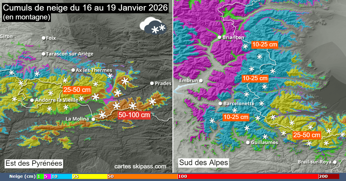 Cumuls de neige prévus du vendredi 16 au lundi 19 janvier 2026 - skipass.com