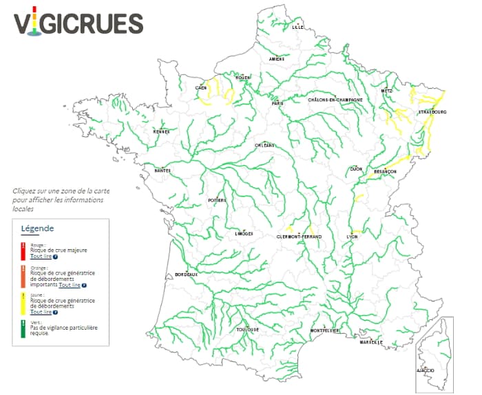 Avec les pluies copieuses observées depuis le début de la semaine, plusieurs cours d'eau ont d'ores et déjà réagi et sont placés en vigilance jaune, dans le Puy-de-Dôme mais aussi du Rhône jusqu'au nord-est. Les tronçons prenant leur source dans les Vosges et le Jura sont les plus concernés et risquent de déborder de manière notable ces prochains jours avec les nouvelles pluies très abondantes qui se profilent.