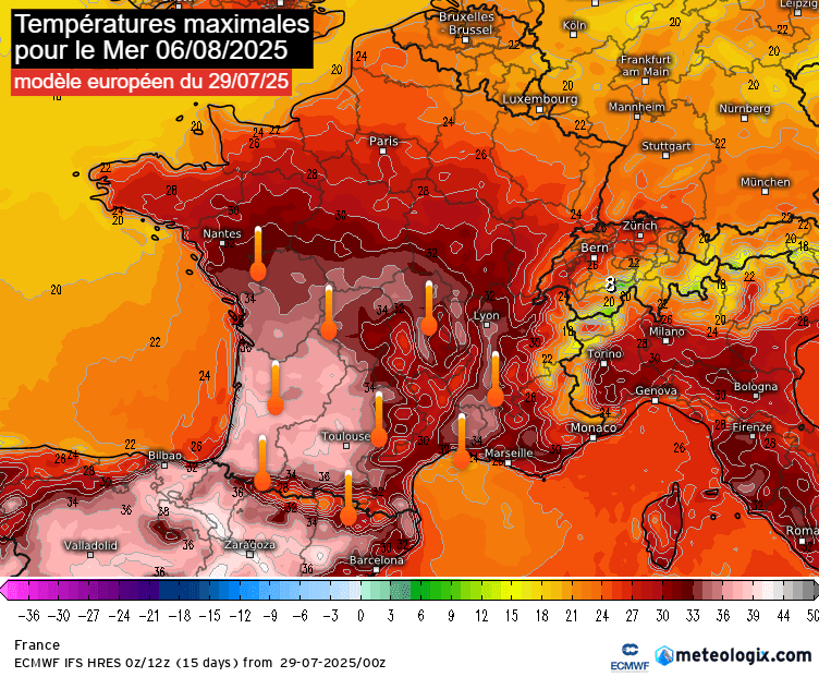 Températures maximales pour le mercredi 6 août 2025 selon le modèle européen du 29/07/25 - meteologix.com