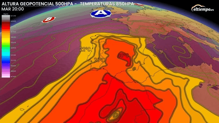 Masse d'air vers 1500m (isobares) pour le mardi 5 août 2025 - eltiempo.es