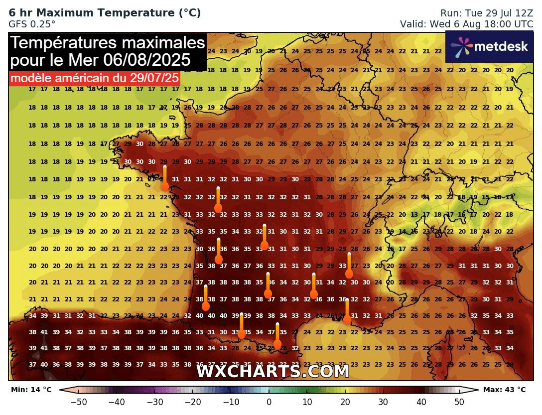 Le modèle américain n'est pas le seul à envisager un épisode de fortes chaleurs la semaine prochaine. Pour l'échéance du mercredi 6 août 2025, le scénario du modèle européen est similaire. Comme l'illustre la carte ci-dessous, il envisage des températures maximales également supérieures à 30°C au sud de la Loire et atteignant 35 à 38°C dans le sud-ouest !