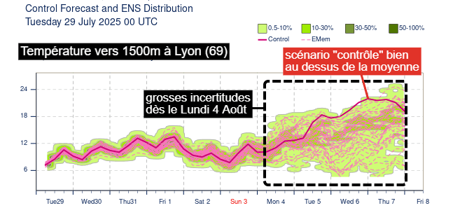 Panel de scénarios du modèle européen de la température vers 1500m à Lyon (69) du 29 juillet au 8 août 2025 - ECMWF
