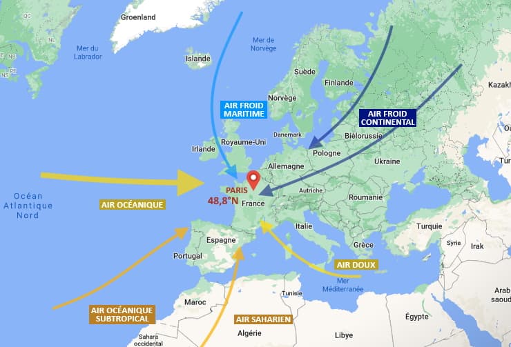 Après avoir vu le rôle majeur des continents sur les climats froids, on comprend mieux pourquoi le climat français est radicalement différent. Notre pays se trouve entouré de mers et d'océan, entre la Mer du Nord, la Manche, l'Atlantique et la Méditerranée. Avec la prédominance du régime zonal, les vents venant de l'océan amènent régulièrement une certaine douceur sur l'hexagone durant la saison hivernale. De plus, la proximité de la Méditerranée et du nord de l'Afrique sont susceptibles de faire remonter un air très doux quand le flux s'oriente au sud.