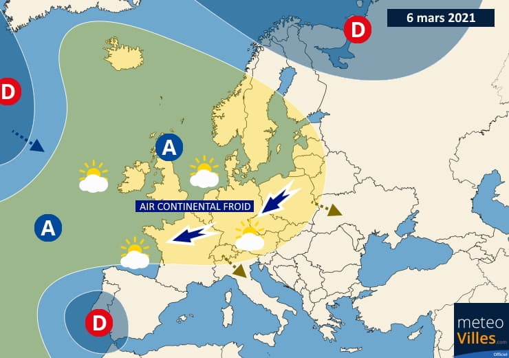 Jusqu'au week-end des 6 et 7 mars 2021, nous étions sous l'influence d'un flux continental concernant notamment le nord de la France. Ce dernier était lié à la présence d'une cellule anticyclonique entre le nord de l'hexagone et l'Islande en passant par les Îles Britanniques et la Mer du Nord.