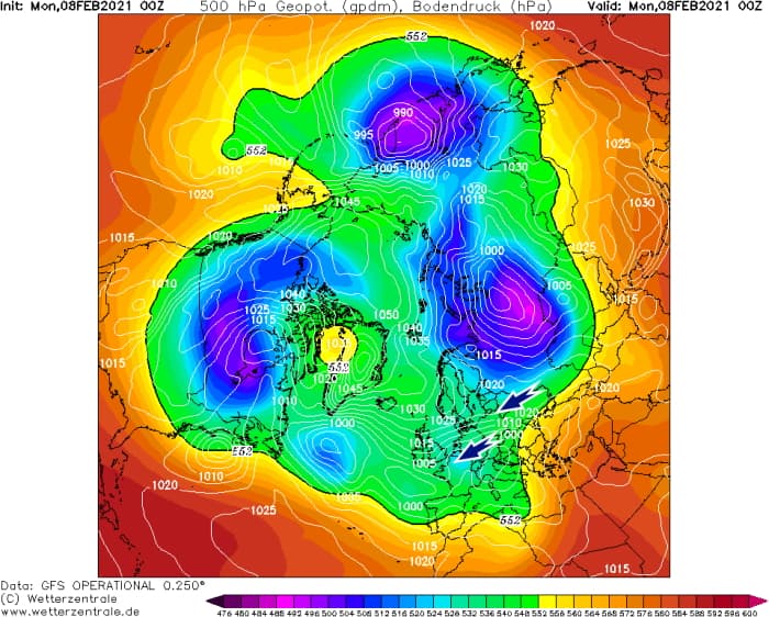 Visualisation du vortex polaire très instable le 8 février 2021 - via wetterzentrale